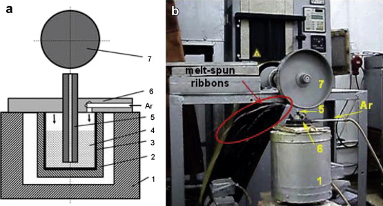 The liquid quenching was performed by employing an own developed and built melt spinning device. In the following, a short description of the device was realized to identify the differences between the present device and the well-known melt spinning method.