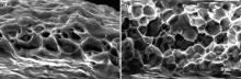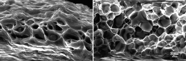| Fig. 10. SEM fractographs of Al–Cu alloys after TO annealing of ribbons: (a) Al–10 wt% Cu, (b) Al–35 wt% Cu. |