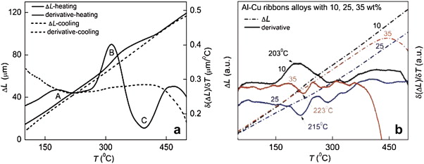 During the heat treatments of Al–Cu alloys a variation of the Cu concentration in α-Al solid solution takes place, having a direct effect on the lattice constant for the elementary cell of Al as shown in Fig. 11<xref ref-type="bibr" rid="R23">[23]. By dilatometric analysis the evolution of the above mentioned structural transformation can be evaluated. Dimensional changes caused by the alloying element are clearly highlighted on the derivative curves of length expansion or contraction. In Fig. 12(a), dilatation–contraction curves and their derivatives for as-cast Al–10 wt% Cu alloy are presented. The analyses were carried out on the samples of 10 mm in length. The contraction curve was registered at a cooling rate of 5 °C/min. Precipitation stages in Al–Cu alloys are as follows: supersaturated solid solution (SSS) → GP zones → θʺ → θʹ → θ, where GP zones are Cu Guinier-Preston zones, θʺ and θʹ are Al2Cu metastable phases, and θ is the equilibrium phase [22], [24] and [25].