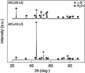 Fig. 3 shows the XRD patterns for Al100- x–Cu x ( x = 10, 35 wt%) alloys ribbons. MS-LP processing did not cause the appearance of new phases compared to those indicated in the Al–Cu diagram. Only XRD profiles for Al–Cu alloys with extreme concentration were reported. In this case, the microstructure consists of two phases, i.e. α-Al and Al2Cu phases. The Al–5 wt% Cu alloy is characterized only by a supersaturated α-Al solid solution. Structural characterization performed on the Al–10 wt% Cu ribbon alloys obtained by MS-LP method, indicates the grain refinement, as shown in Fig. 4. The SDAS value is about 25 μm ( Fig. 4(a)), for as-cast Al–10 wt% Cu alloy. For the as-ribbon alloy, the same parameter has an average value of 0.06 μm. By considering the SDAS parameter for the as-cast Al–10 wt% Cu alloy, the value of n exponent from Eq. is 0.33, being in a good agreement with literature [22]. The morphology of θ phase evolves to a globular shape after TO annealing heat treatment; the dimension of such phases varies between 2 and 3 μm as indicated in Fig. 4(b). The structures of 15 and 25 wt% Cu alloys are similar to the Al–10 wt% Cu, but with a higher amount of the Al2Cu phase. The size of Al2Cu particles does not exceed 4 μm after the annealing process. Compositional analysis carried out on the alloys with 10 wt% Cu indicates an increase of Cu solubility in the matrix till to 3.38 wt% ( Fig. 5(a)). For Al–10 wt% Cu melt-spun ribbons subjected to annealing treatment, the concentration of Cu in α-Al decreases to about 1.74 wt% ( Fig. 5(b)).