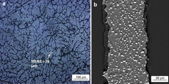 | Fig. 4. Al–10 wt% Cu alloy structure: (a) as-cast in metallic die (OM), (b) ribbon after TO annealing treatment (SEM). |