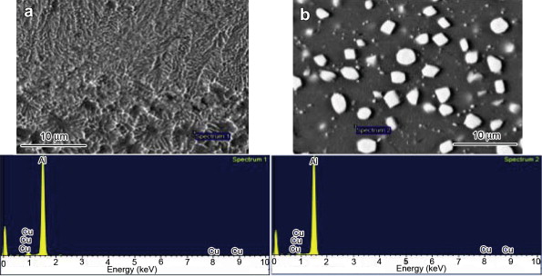 | Fig. 5. SEM images and EDS spectra of Al–10 wt% Cu alloy: (a) ribbon obtained by MS-LP technique, (b) annealed melt-spun ribbon at TO condition. |