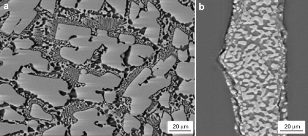 | Fig. 6. SEM images of Al–35 wt% Cu alloy structure: (a) as-cast in metallic die, (b) ribbon after TO annealing treatment. |