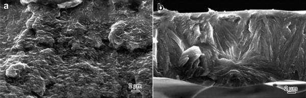| Fig. 7. SEM fractographs of Al–Cu alloys obtained by MS-LP: (a) Al–10 wt% Cu, (b) Al–35 wt% Cu ribbons. |