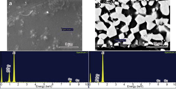 Comparisons of the as-obtained melt-spun ribbons and the annealed samples were carried out. EDS analysis of Al–35 wt% Cu melt-spun ribbons indicates a concentration of 25.51 wt% Cu in the α-Al solid solution ( Fig. 8(a)). For the following annealing treatment a clear evidence of the Al2Cu particles is observed with a decrease of Cu in α-Al to a value of 2.48 wt% ( Fig. 8(b)).