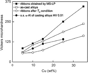 Microhardness measurements ( Fig. 9) provide additional information to the structural characterization of the obtained alloys. The microhardness values were obtained after 50 measurements for each sample. In the case of the α-Al phase of the as-cast alloys in metallic die 30 indentations were performed. The average value of microhardness for the intermetallic phase θ (Al2Cu) is 410 HV and seems to be independent on the manufacturing conditions. The microhardness value of α-Al depends on the concentration of Cu retained in the solid solution.