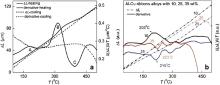 | Fig. 12. DIL analyses: (a) dilatation–contraction curves and their derivatives for Al–10 wt% Cu alloy as-cast in metallic die, (b) dilatation curves and their derivatives for Al–Cu alloys with 10, 25, 35 wt% Cu obtained by MS-LP. |