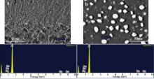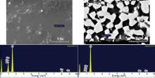 | Fig. 8. SEM images and EDS spectra of Al–35 wt% Cu alloy: (a) ribbon obtained by MS-LP technique, (b) annealed melt-spun ribbon at TO condition. |