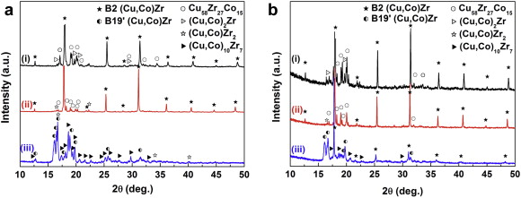 When the Co content of the ingots decreases to 12.5 at.%, the reflections of the ternary phase seem to become weaker and, in addition, (Cu,Co)Zr2 reflections with a low intensity appear ( Fig. 1(a)). The main phase, however, is B2 (Cu,Co)Zr2.