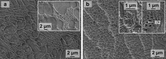 The microstructure of the Cu40Zr37.5Co22.5 rod is depicted in Fig. 2(a). The B2 dendrites have a typical size of 4–6 μm and are surrounded by multiple interdendritic phases. The B2 phase has been slightly etched away by the polishing agent so that a relief remains. As EDX measurements prove, the interdendritic region mainly consists of B2 phase and the ternary Cu58Zr27Co15 phase. Even though it is detected by X-ray diffraction, (Cu,Co)2Zr cannot be unambiguously identified via SEM in the rod. However, in the case of the ingot a substantial volume fraction of (Cu,Co)2Zr can be seen (Table 1) and this might be caused by the lower cooling rate under which the ingot solidifies resulting in larger particles. This phase forms needle-shaped particles, which are embedded in the B2 phase and the ternary phase of the interdendritic region (not shown here). The inset of Fig. 2(a) represents an SEM micrograph of the Cu40Zr37.5Co22.5 ingot, which reveals slightly larger dendrites (about 6–12 μm) due to the lower cooling rate. At the same time the volume fraction of the interdendritic phases is lower ( Fig. 2(a), Table 1) and their morphology changes. While the two phases are arranged in a plate-like or lamellar structure in the rod ( Fig. 2(a)), the B2 crystals have a more globular appearance in the case of the ingot (inset of Fig. 2(a)).