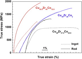 In the next step all samples were subjected to compressive loading ( Fig. 3) and the characteristic values are specified in . With the exception of Cu49Zr49Co2 there are distinct differences in the response to mechanical loading between the ingot material and the rods.