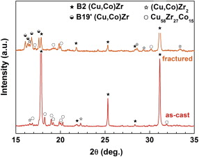 In the case of CuZr-based BMG matrix composites, Co appears to be an interesting alloying element. As opposed to B2 CuZr [20], B2 CoZr is stable at room temperature [21] and consequently Co additions stabilise the B2 (Cu,Co)Zr phase [22]. Even minor amounts of Co in a Cu–Zr–Al alloy seem to promote the formation of B2 crystals and to lead to a composite microstructure, which exhibits pronounced tensile strain [16]. Moreover, minor Co additions also lower the temperatures, at which the martensitic transformation occurs [23], and thus influence the shape memory behaviour of the B2 phase.