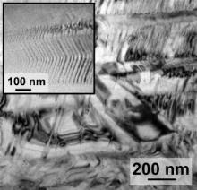 | Fig. 4. TEM image of Cu49Zr49Co2 rod after deformation. Deformed martensite plates can be seen and within the martensite a high density of twins is present (inset). |
