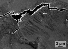 The horizontal arrows in Fig. 6 indicate martensite laths in a part of a dendrite. The martensitic transformation of the B2 phase seems to be induced by the stress concentrations in front of the propagating crack. Therefore, this material can harden significantly till fracture eventually sets in ( Fig. 3). The analysis of the fractured rod showed that a pore again caused failure.