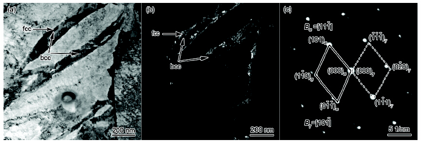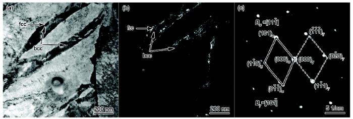 图5为试样No.8的TEM像. 其中, 图5c是图5a中衬度较深的板条(箭头所指区域)的SAED谱. 经分析标定可知, 其中有bcc相