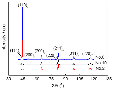式中, Vγ是残余奥氏体的体积分数; I a是马氏体的{200}和{211}任一晶面衍射峰的累积强度; I g是奥氏体{200}, {220}和{311}任一晶面衍射峰的累积强度; G为奥氏体某一晶面与马氏体某一晶面强度有关的因子之比.
