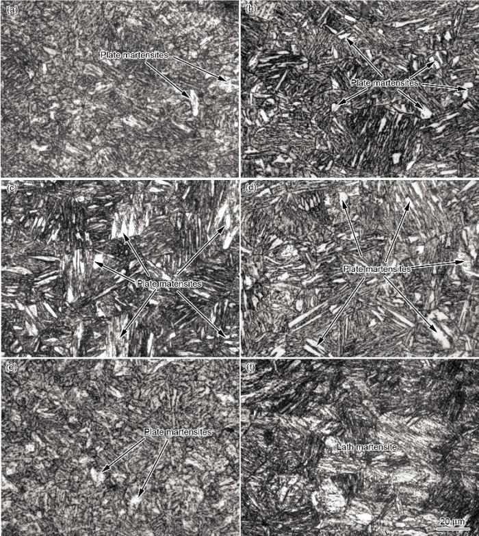 图1为经不同工艺热处理后试样的OM像. 其中图1a~e为经一步Q&P工艺处理后试样的显微组织, 图中的黑色区域为配分前淬火产生的低C板条马氏体; 白色区域为配分后淬火形成的高C片状马氏体, 其体积分数分别为2.6%, 4.9%, 9.4%, 5.2%和1.9%. 可以看出, 随配分时间的延长, 片状马氏体含量先增多后减少, 在配分10 min (试样No.6)时达到峰值. 文献[18]表明, 形成片状马氏体的最低C含量为0.60%, 形成残余奥氏体的最低C含量利用Ms的经验公式进行估算[24]: