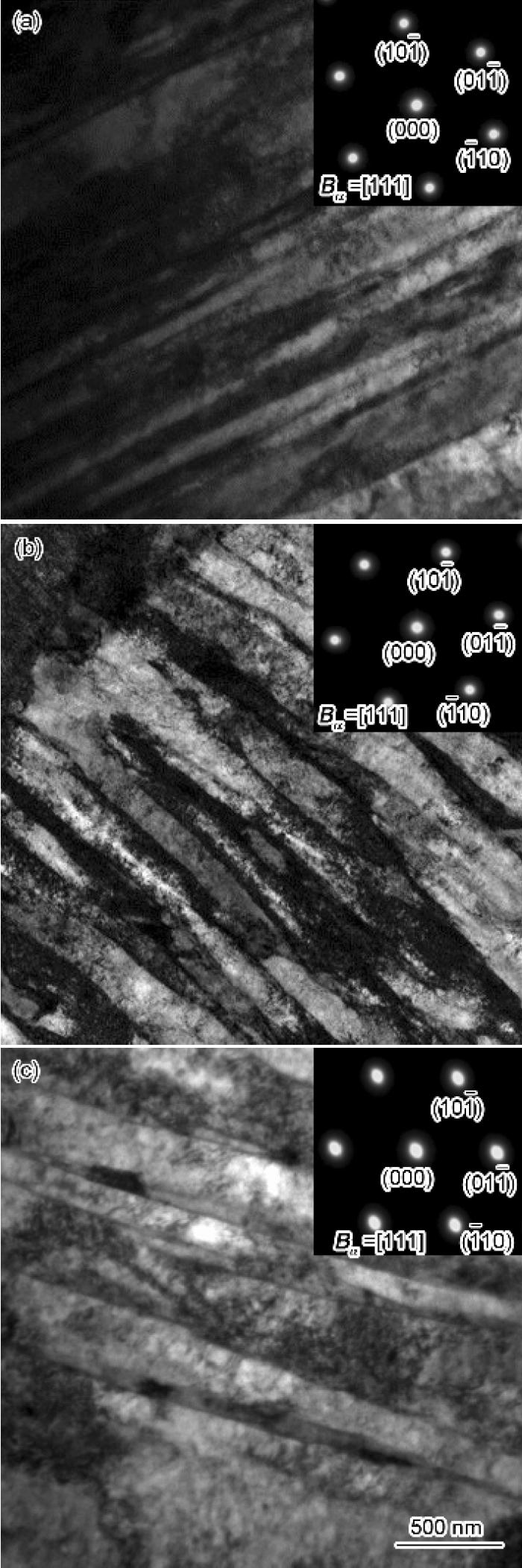 ![]() | Fig.3 TEM images and corresponding SAED patterns of the martensite (insets) of samples No.1 (a), No.2 (b) and No.3 (c)图3 试样No.1~No.3的TEM像和SAED谱 |