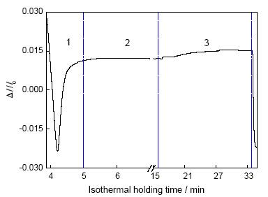 ![]() | Fig.2 Dilatation curve of sample No.8 (Δl—expansion increment, l0—original length, area 1—quenching process, areas 2 and 3—isothermal processes)图2 试样No.8的膨胀曲线 |