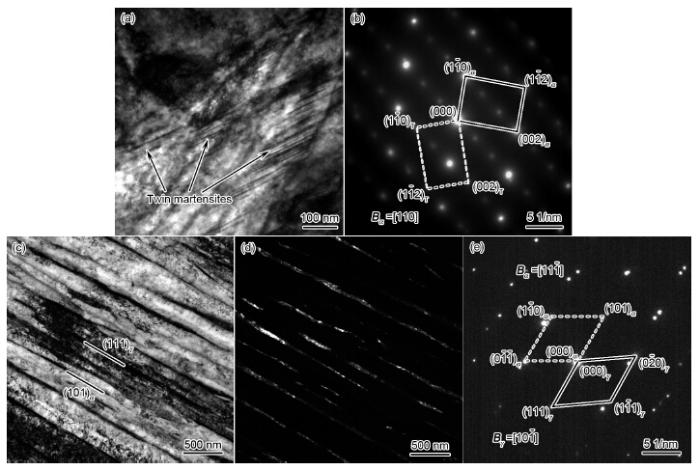 图4为试样No.6的TEM像和SAED谱. 可以看出, 其组织主要包括2种不同形态的马氏体以及板条间薄膜状残余奥氏体. 图4a中箭头所指区域为孪晶马氏体, 与OM像中白色区域的片状马氏体相对应. 图4b为bcc孪晶[110]晶带轴的SAED谱, 通过对其分析标定可知, 孪晶马氏体的孪生面为