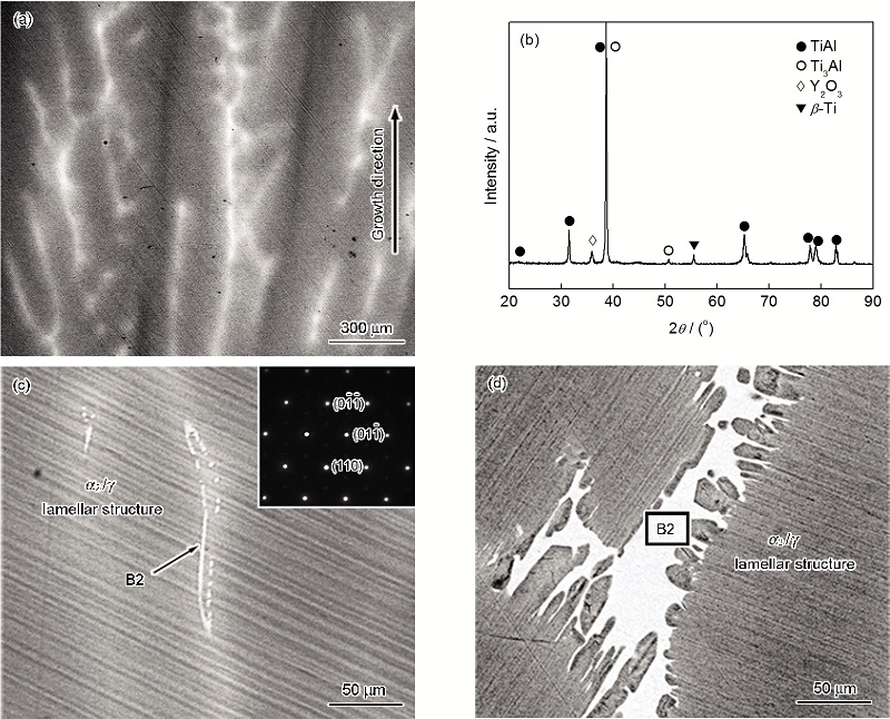 2.1.2 相组成 图2显示了定向凝固Ti-46Al-Nb合金典型的微观组织及其相组成. 可见, 最终组织中层片组织呈45°或平行于生长方向, 这是由具有领先 b相的凝固过程决定的. TiAl合金中最终层片组织与领先 b相存在着特定的取向关系: {110} b//(0001) a//{111} g, <111> b//<11
