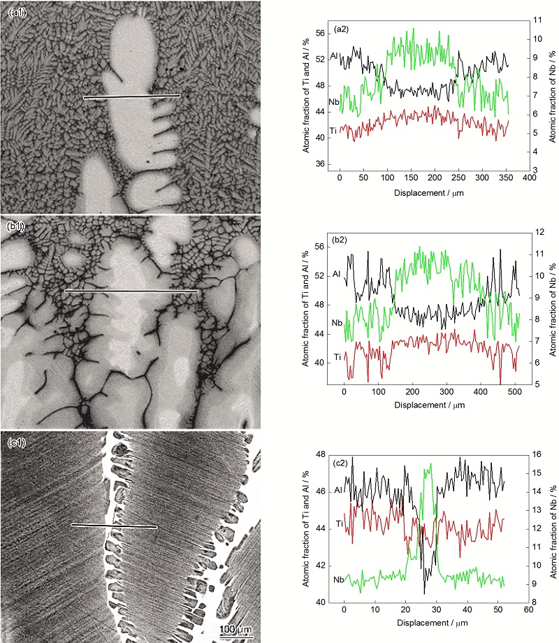 定向凝固TiAl-Nb合金中溶质元素存在多种偏析模式, 并严重影响着TiAl-Nb合金的相变过程和微观组织演化. 图5显示了上述不同相变过程(完全 b相凝固、包晶反应凝固过程)中溶质偏析情况及微观组织演化. 图5a1~c1显示了定向凝固Ti-46Al-8Nb合金在生长速率为5 μm/s时具有L+ b→ a包晶反应过程中不同阶段溶质元素偏析及微观组织变化情况. 如图5a1所示, 在凝固过程初期为初生 b相生长阶段(即L+ b区), 此时会发生S型偏析, 在枝晶间富Al而在枝晶干富Nb. 随着初生 b相的生长, 枝晶间富Al的程度逐渐增加, 当满足包晶反应时即发生L+ b→ a包晶反应. 如图5b1所示, 灰色的包晶 a相依附在白亮的初生 b相上生长, 枝晶心部为残余的 b相而枝晶间为富Al的液相区. 随着包晶反应的进行, 初生 b相以及枝晶间液相的体积分数逐渐减小, 枝晶心部残余 b相中富Nb贫Al的程度增加. 随着温度的进一步降低, 枝晶干残余 b相会发生 b→ a转变生成 a相, 此时溶质元素会发生 b型偏析, 在枝晶心部形成分散的网状Nb的富集区, 并促进了B2相的析出, 枝晶间区域被包晶 a相所占据, 该区域没有发现溶质Nb偏析, 如图5c1所示. 最终组织由 a2/ g层片组织与在枝晶心部集中分布的B2相组成. 由上述结果可以看出, 包晶反应造成了严重的溶质偏析, 容易引起大量B2相在枝晶心部的集中分布. 硬脆的B2相常被认为是室温下断裂的裂纹源, 同时降低高温强度, 因此包晶反应的发生以及B2相的集中分布可能造成最终组织以及力学性能的分散性, 因此, 在合金设计及凝固条件的选择时应该尽量避免包晶反应和大量B2相的形成.