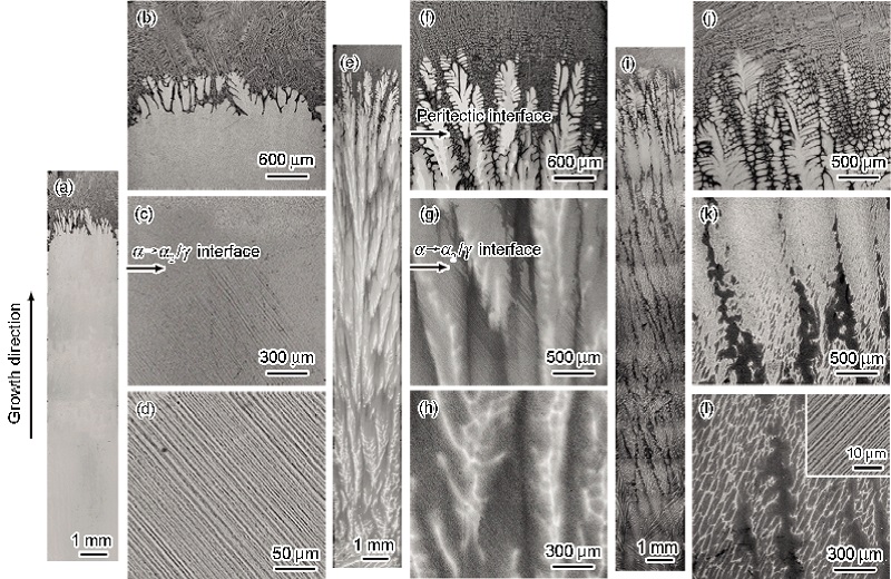 ![]() | Fig.3 Longitudinal macrostructures and corresponding microstructures of directionally solidified Ti-46Al-Nb alloy with different Nb contents and growth rates(a) macrostructure of Ti-46Al-8Nb alloy, V=2 μm/s(b~d) microstructures of Ti-46Al-8Nb alloy, V=2 μm/s(e) macrostructure of Ti-46Al-8Nb alloy, V=3 μm/s(f~h) microstructures of Ti-46Al-8Nb alloy, V=3 μm/s(i) macrostructure of Ti-46Al-10Nb alloy, V=30 μm/s(j~l) microstructures of Ti-46Al-10Nb alloy, V=30 μm/s, inset in Fig.3l show the locally magnified image图3 定向凝固Ti-46Al-Nb合金在不同生长速率和Nb含量下的宏观组织以及相应的微观组织 |
