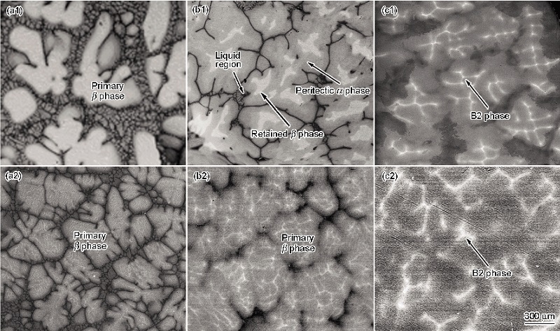 除此之外, b相稳定元素Nb的富集会促进高温 b相在室温下保持稳定而形成B2相. 硬脆的B2相常被认为是室温变形过程中的裂纹源, 并且会降低TiAl合金的高温强度. 然而, 适当的B2相常常被引入而有助于提高热成形性能[17,18,19,20]. 因此, TiAl-Nb合金中B2相的起源及其分布得到了大量的研究[21,22]. 目前有关B2相的形成主要有2种机制: (1) 在 b→ a转变过程中Nb在残余 b相中的富集促进的有序化转变; (2) 在层片形成过程中通过 a+ g→ a2+ g+B2转变析出. 同时, B2相的形态、尺寸和分布强烈地依赖于凝固条件和溶质偏析程度, 对其影响规律缺乏深入理解. 因此, 进一步考察高Nb含量TiAl合金中B2相的形成和分布特点有助于该合金组织的准确控制和力学性能的提高.