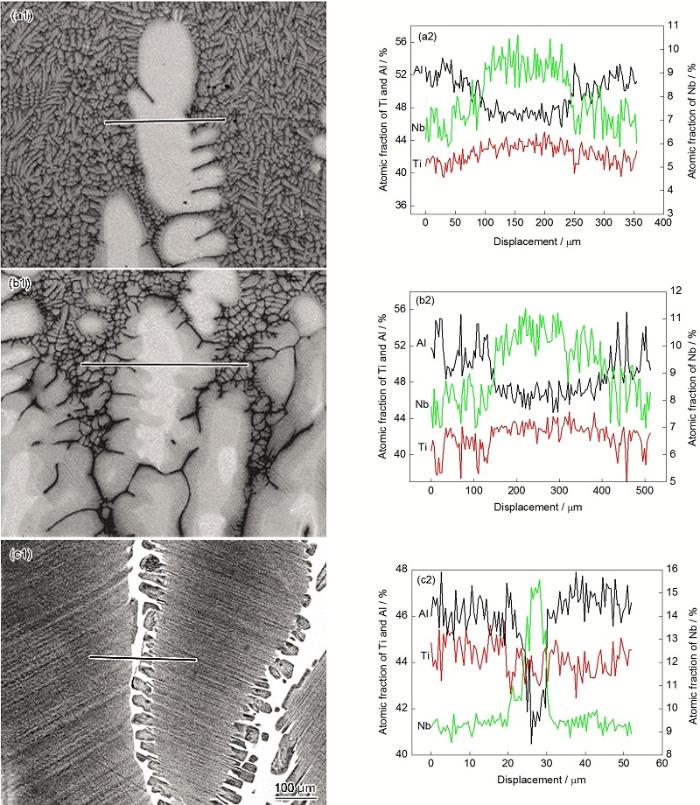 TiAl基合金具有较低的密度、优良的抗氧化性、良好的高温比强度和抗蠕变等性能, 是具有发展前景的新一代高温轻质结构材料[1,2,3,4,5]. 然而, 常规TiAl合金的应用仍然需要提高其抗高温性能和抗氧化性[6,7]. 溶质Nb的加入可以有效提高TiAl合金的高温强度与高温抗氧化性, 同时Nb在TiAl合金中具有较高的溶解度, 是发展高温高性能TiAl合金的有效手段. 高Nb含量TiAl合金的使用温度比常规TiAl合金高60~100 ℃, 代表着发展更高使用温度TiAl合金的先进方向, 是航空发动机和燃气机高温部件用先进材料[8,9,10]. 但是, Nb的添加会改变TiAl合金相图, 使得高Nb含量TiAl合金的相变行为与TiAl合金存在较大差异, 相应的微观组织也存在复杂的变化. 由已获得的部分TiAl-Nb合金相图可以看出, 溶质Nb的添加显著提高了TiAl合金熔点并促进 b相区向高Al含量方向移动, 并导致最终形成复杂的多相组织[11,12,13]. 另外, 凝固条件的变化引起复杂的溶质偏析也会限制对TiAl-Nb合金组织演化的理解, 可能造成组织的分散性进而影响力学性能[14,15,16]. Chen等[15]分析了TiAl-Nb合金铸锭中溶质元素的偏析行为, 结果表明主要存在S型、 b型和 a型3种溶质偏析, 不同的溶质富集过程会使得组成相在晶粒间分布存在差异. 因此, 考察高Nb含量TiAl合金不同凝固条件下的相变行为、组织演化和溶质偏析规律有助于加深对该合金的理解并进一步促进其工程化应用.