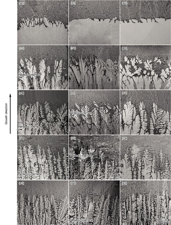 2.1.1 固/液界面形貌 图1显示了定向凝固Ti-46Al合金不同生长速率和Nb含量下的固/液界面形态. 可见, 随着生长速率的增加, 固/液界面发生了平界面-胞状界面-枝晶界面形态的转变. 当生长速率为2和3 μm/s时, 淬火界面分别为浅胞状界面和胞状-枝晶混合界面生长, 如图1a1~a3和b1~b3所示. 当生长速率较高时(≥5 μm/s), 固/液界面为发达的枝晶生长, 并且随着生长速率的增加枝晶间距逐渐减小, 如图1c1~c3, d1~d3和e1~e3所示. 在枝晶生长阶段, 枝晶的二次枝晶臂生长方向严格地垂直于一次枝晶臂方向, 根据TiAl合金中初生相枝晶的对称性, 可以判断3种成分合金的初生相为bcc结构的 b相.