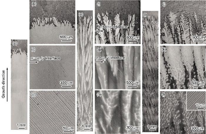 2.1.3 相变路径 图3显示了定向凝固Ti-46Al-Nb合金在不同生长速率和Nb含量下的宏观组织以及相应的微观组织. 图3a为定向凝固Ti-46Al-8Nb合金在生长速率为2 μm/s时的宏观组织. 可以看出, 在定向凝固区内溶质分布均匀无明显偏析. 从图3b的微观组织可以看出, 固/液界面为初生 b相的深胞状生长. 随着相变过程的进行, 在微观组织中出现了层片组织的析出界面, 如图3c中箭头所示. 最终获得了与生长方向呈45°的层片组织, 同时也说明该生长速率下合金的初生相为 b相(图3d). 由上述分析可知, Ti-46Al-8Nb合金在较低生长速率下(≤2 μm/s)的相变路径可以描述为: