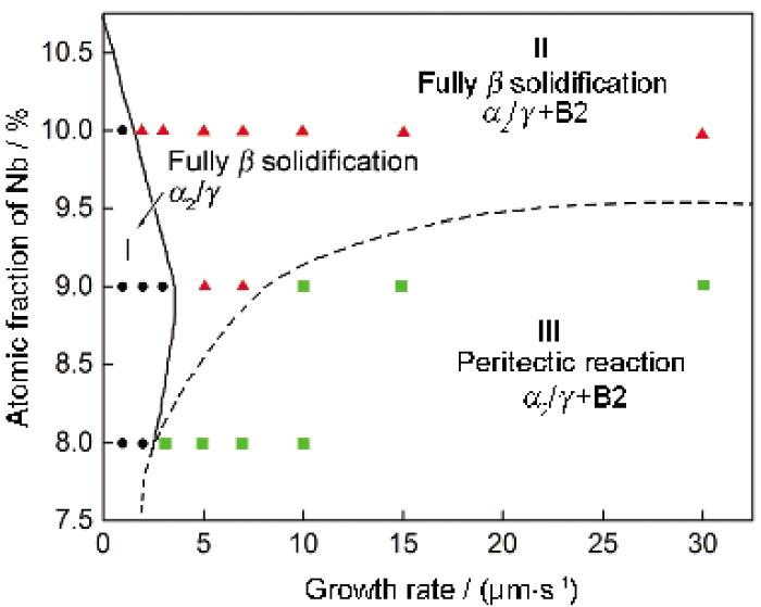 由以上分析可以得出, 定向凝固TiAl-Nb合金的相变过程以及微观组织随着生长速率和Nb含量的变化而发生改变, 并与溶质偏析情况密切相关. 图6显示了定向凝固Ti-46Al-Nb合金相变过程与微观组织选择图. 可以看出, 在较低的生长速率(≤3 μm/s)和较宽的Nb含量范围内, 可以获得完全 b相的凝固过程以及 a2/ g层片组织, 如图6中I区所示. 生长速率的增加能够促进B2相的析出, 在具有较高的Nb含量(≥9%Nb)对应着完全 b相的凝固过程中, 获得了具有 a2/ g层片和B2相的微观组织, 如图6中II区所示. 在具有较低Nb含量以及高的生长速率时, 获得了L+ b→ a包晶反应以及 a2/ g层片和B2相的多相组织, 如图6中III区所示.