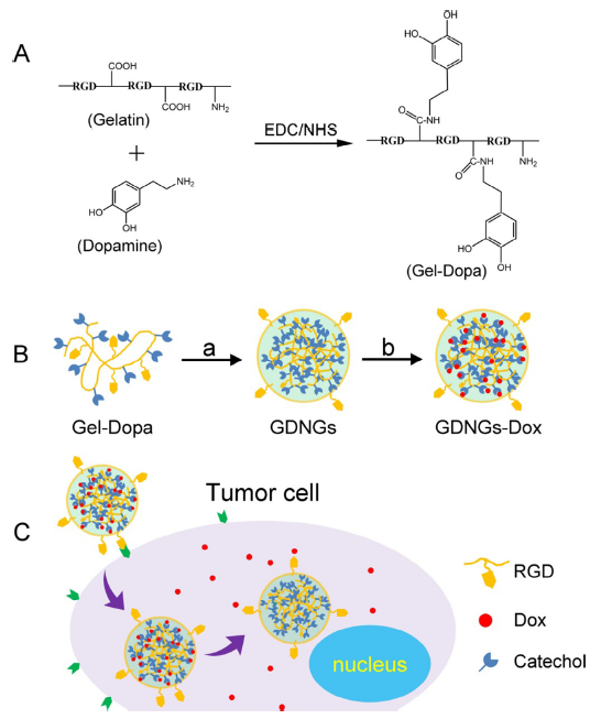 Here, the gelatin-based GDNGs have been prepared from Gel-Dopa conjugate using the classical desolvation process. The introduction of catechols in Gel-Dopa precursor enables the GDNGs to load the model drug, namely Dox, by Fe3+ mediated coordination cross-link and result of GDNGs-Dox. These nano-gels disperse individually with spherical shape in a homogeneous size distribution in aqueous solution. The GDNGs-Dox can be easily internalized by tumor cells due to the inherent RGD sequence in gelatin; subsequently, Dox molecules are released from the internalized GDNGs-Dox and kill the tumor cells. These results suggest that the GDNGs are promising intracellular drug delivery vehicles for cancer therapy.