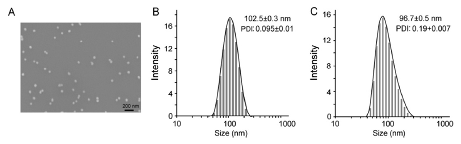 The GDNGs and GDNGs-Dox solution is dropped on a silicon wafer, and dried at 40 °C for 12 h. The sample is sputter-coated with gold for 90 s. The morphologies of GDNGs and GDNGs-Dox are acquired by using the field emission scanning electron microscopy (FESEM, Hitachi S4500). The sizes are manually measured on the FESEM images, respectively.