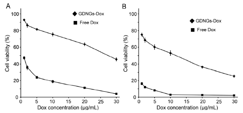 Viability of the HeLa cells after treatments with free Dox or GDNGs-Dox for 24 (A) and 48 h (B), respectively.