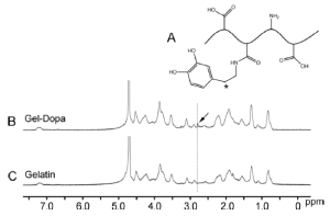(A) Schematic structure of the Gel-Dopa precursor: 1H NMR spectra of Gel-Dopa (B) and gelatin (C), respectively.