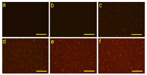 Fluorescent micrographs of the HeLa cells incubated with GDNGs-Dox suspension, in which the relative Dox concentration is increased from 1.0 (a) to 2.0 (b), 5.0 (c), 10 (d), 20 (e), and 30 (f) µg/mL. Scale bar is 200 µm.