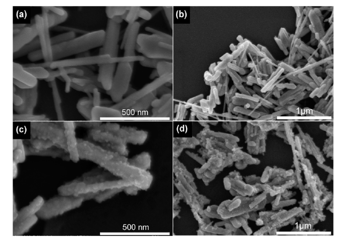 Fig. 1. SEM images of (a, b) ZnWO4 nanorods and (c, d) ZnWO4@SnWO4 heterostructure.