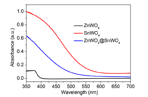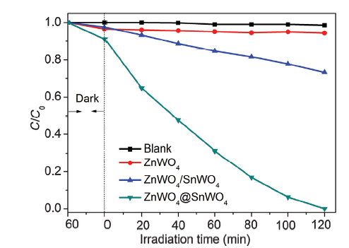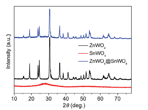 ZnWO4@SnWO4 nanorod composite was prepared by an in-situ synthetic method. 2 mmol ZnWO4 nanorods and 80 mL of distilled water were added into a 150 ml three-necked flask, and the dispersion was refluxed at 120 °C. Then, the pH of mixed solution was adjusted to 5 using 0.1 mol/L HCl. Subsequently, 0.2 mmol SnCl2•2H2O and 1 mL of 0.2 mol/L Na2WO4 solution were added into the mixed solution each time at an interval of 3 h for several times. After being added, the mixed solution was continuously refluxed at 120 °C for 3 h. The obtained yellow sample was washed with distilled water and ethanol by centrifugation, and then dried in an oven at 60 °C for 12 h. SnWO4 sample using the above synthetic method was prepared, except that ZnWO4 nanorods didn’t be added. The sample denoted as ZnWO4/SnWO4 was prepared by the mechanical mixing of SnWO4 with ZnWO4, and the mass ration of ZnWO4 and SnWO4 is equal for ZnWO4/SnWO4 and ZnWO4@SnWO4 samples.