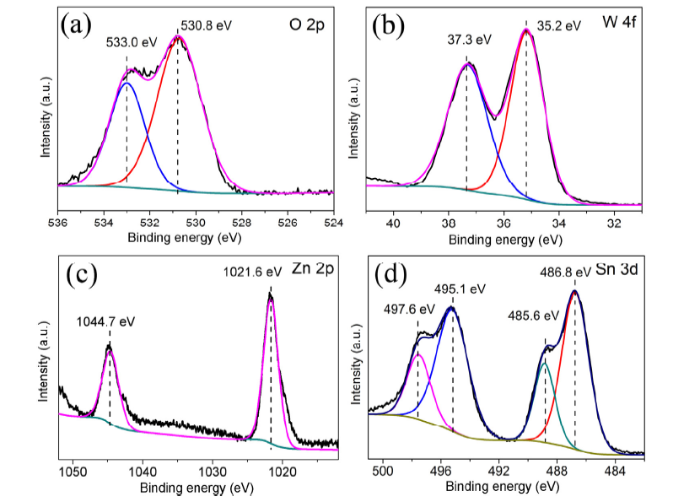 XPS was employed to investigate the chemical and binding state of SnWO4 nanoparticles on the surface of ZnWO4 nanorods, as shown in Fig. 5. Fig. 5(a)-(d) displays the high resolution XPS spectra for O 2p, W 4f, Zn 2p and Sn 3d, respectively. Fig. 5(a) shows the binding energy of O 1s at 530.8 eV and 533.0 eV. The lower binding energy peak at 530 eV can be attributed to the metal bound oxide component (O2-) of [WO4]2-, and the peak at 533.0 eV is assigned to the surface adsorbed or structural water molecules [[23], [24], [25]]. The XPS spectrum of W 4f shows two characteristic peaks at around 35.2 eV for W 4f7/2 and 37.3 eV for W4f5/2, respectively, suggesting that W exists as W6+ in ZnWO4@SnWO4 nanorods [24,26]. Meanwhile, the binding energy of Zn 2p also can be observed at 1021.6 eV and 1044.7 eV, which is attributed to Zn2+ in ZnWO4 nanorods [23]. In addition, the XPS spectrum of Sn 3d can be clearly observed, which further demonstrates the existence of amorphous SnWO4 nanoparticles. However, the Sn 3d XPS spectrum of ZnWO4@SnWO4 nanorods displays two core level peaks at ca. 486.8 eV and 488.9 eV, which is assigned to Sn2+ in SnWO4 and Sn4+ species, respectively [24,26]. It suggests that a small parts of Sn2+ ion is oxidized into Sn4+ species in the prepared process. Combining with the result of XRD pattern, the SnO, SnO2 or Sn3O4 samples did not be detected in the SnWO4 sample or ZnWO4@SnWO4 nanorods. Those results demonstrate that the Sn4+ species may be Sn4+ ion, which is adsorbed on the surface of ZnWO4@SnWO4 nanorods, so it can be detected by XPS measurement.