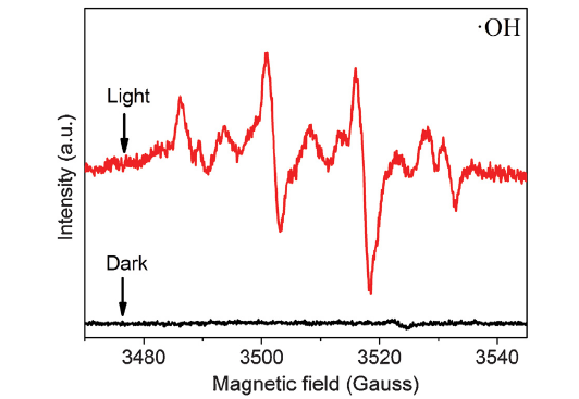 The specific active species of ZnWO4@SnWO4 sample was further explored by electron spin resonance (ESR) measurement in photocatalytic reaction process, as shown in Fig. 7. Obviously, the four characteristic peaks of DMPO-•OH adducts can be clearly observed, indicating that the OH- can be oxidized into •OH by the photogenerated holes in the valence band of ZnWO4@SnWO4 sample. On comparison, there is no signal of DMPO-•OH adducts under dark test condition. It indicates that the hydroxy radical (•OH) are indeed produced in the reaction system of ZnWO4@SnWO4 photocatalyst in aqueous solution under visible light irradiation. Simultaneously, in order to verify whether the superoxide radical (•O2-) can be generated in the photocatalytic process, the ESR measurement of ZnWO4@SnWO4 photocatalyst can be carried out in DMPO methanol solution under visible light irradiation, as displayed in Fig. S2. However, there is no signal of DMPO-•OH adducts in DMPO methanol dispersion. In conclusion, it demonstrates that the •OH is main active species in the photocatalytic process.