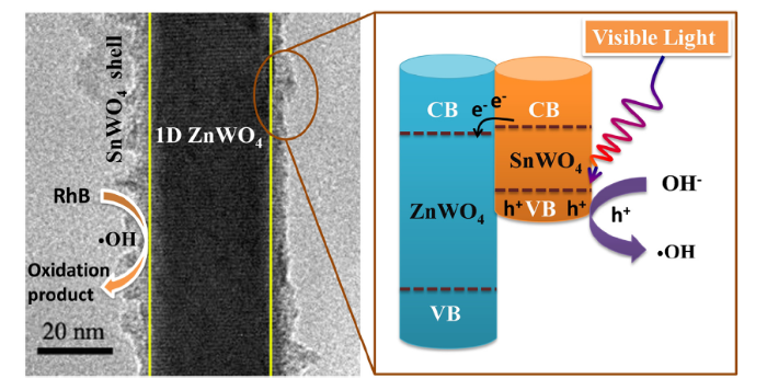 The one-dimensional ZnWO4@SnWO4 photocatalyst with a core-shell heterostructure was successfully constructed by a simple two-step method. It is interesting to note that ZnWO4@SnWO4 composite photocatalyst owns a higher photocatalytic activity for RhB degradation under visible light irradiation. The introduction of SnWO4 shell layer, which forms a clear heterogenous interface between ZnWO4 and SnWO4, increases the photo-absorption efficiency of ZnWO4 nanorods. In addition, its band-edge absorption evidently shifts toward the visible region. Based on the photoelectrochemical (PEC) and electron spin resonance (ESR) measurements, it is found that the photocatalytic activity was attributed to the efficient separation and transfer of photo-generated charge carriers. Hence, they can produced more hydroxyl radical (•OH) as the main active species in the photocatalytic reaction process.