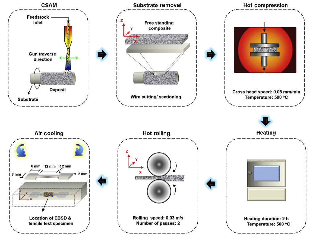 Recently, Zhao et al. has demonstrated the fabrication of highly dense free standing Ni-Al bulk material through cold spraying coupled with cold-pack rolling [19]. Keeping in view the recent paradigm shift in cold spraying technology from traditional repairing/near-net shaping applications to fabricate free standing structural or functional components, it is of paramount importance to unearth innovative and cost effective post-deposition treatments to efficiently heal out splat boundaries and rejuvenate mechanical properties of CSAMed deposits. In this study, we propose a hybrid post-deposition (i.e. hot compression + hot rolling) treatment that could be effectively used to efficiently improve interfacial bonding and invigorate the mechanical properties of CSAMed Al/B4C composites.