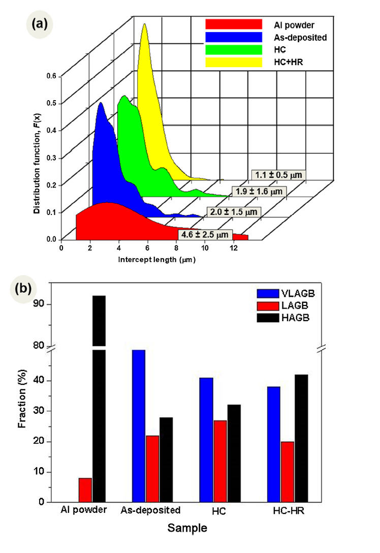 Fig. 3. Aluminum grain size distribution (a) and fraction of various types of grain boundaries (b) in as-received powder as well as in as-deposited, HC and HC + HR samples.