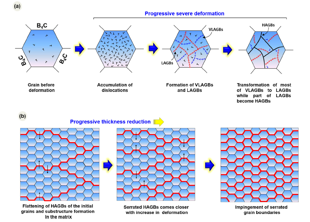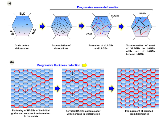 (2) At 30% thickness reduction (in HC sample), bonding between Al-Al and Al-B4C interfaces was significantly enhanced while multi-modal grain size distribution was obtained for the matrix with almost unchanged average grain size. In contrast, 70% accumulative thickness reduction (in HC+HR sample) resulted in extensively refined unimodal Al grains throughout the matrix due to simultaneous operation of CDRX and GDRX mechanisms.