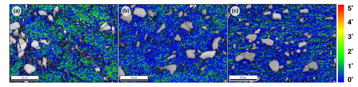 Kernel average misorientation (KAM) maps of different samples, showing variation in average misorientation (<5°) of a pixel with its entire first nearest neighbors, are shown in Fig. 6(a)-(c). Due to high degree of cold working in spraying operation, the as-deposited sample shows a dense population of unevenly distributed dislocation networks/lattice strains [5,20,30]. This is quite consistent with the presence of high fraction of VLAGBs in as-deposited sample (Figs. 2(d) and 3 (b)). With increase in deformation strain (in HC and HC + HR samples), cold working induced localized dense networks of dislocations were replaced by increasingly uniform distribution of dislocations. These dislocations could be anticipated as GNDs evolved as an outcome of the deformation incompatibility between matrix and particulate phases.