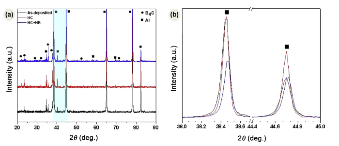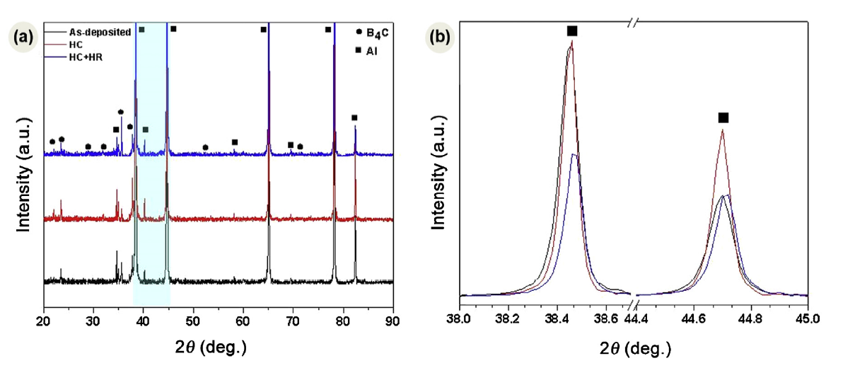 Fig. 7(a) shows XRD patterns of as-deposited, HC and HC + HR samples. In all samples, only diffraction peaks of Al and B4C are detectable, indicating that post-deposition treatments did not result in the formation of significant amount of undesired phases like Al3C, AlB2, AlB12C2, Al3BC, which are often formed in traditional L/M or P/M processes [2,23]. A close examination of XRD patterns reveals that Al peak intensities, their position and width are continuously changed with increase in the degree of deformation. Fig. 7(b) presents a magnified view of the shaded region marked in Fig. 7(a) showing obvious fluctuations in peaks intensity, position and full width at half maximum. This could be associated with change in dislocation density, lattice distortion and progressive grain refinement of the matrix at different stages [31].
