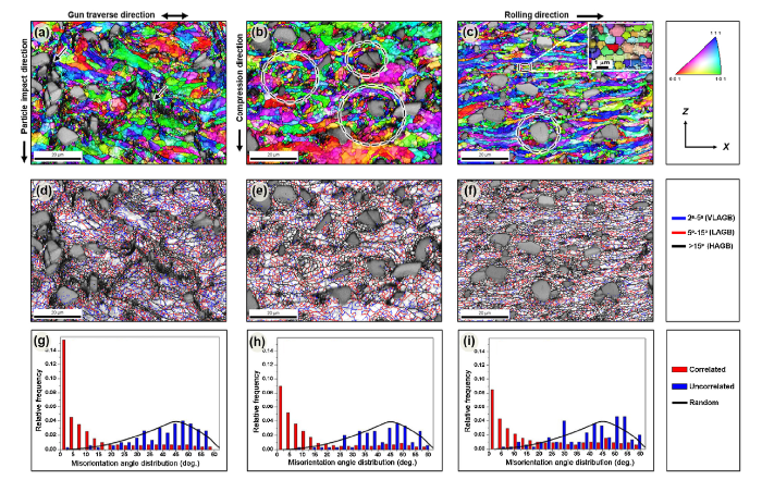 Fig. 2(a)-(c) shows color coded inverse pole figures (IPFs) super imposed on band contrast images of as-deposited, HC and HC + HR samples while Fig. 2(d)-(f) and (g)-(i) shows corresponding grain boundary maps (GBMs) and misorientation angle distributions (MADs), respectively. The as-deposited sample displays heterogeneous deformation of Al splats containing randomly oriented grains. Due to high strain rate deformation at splat boundaries, the grains located near the splat edges are stretched out and transformed into ultrafine grains through continuous dynamic recrystallization (CDRX) phenomenon [5]. The grains existing at splat interior are partially deformed and almost maintained their initial morphology (Fig. 2(a)). Besides, low indexed regions at majority of Al-Al and Al-B4C interfaces (highlighted by arrows) are observed which either indicate weak bonding, high defect density or lattice strain at the interfacial regions [21,22]. In contrast, HC and HC + HR samples led to increasingly high band contrast values (i.e. reduced fraction of low or un- indexed regions), indicating progressive reduction of inter splat defects and improved interfacial bonding [5,20]. The reduction of interfacial defects could be associated with enhanced diffusional activity facilitated by increased interfacial contact area of Al-Al and Al-B4C particles [19,20]. To validate gradual healing of inter-splat defects and improvement of interfacial bonding, apparent porosity of the samples was calculated. The porosity values of the samples under different processing conditions were in accordance with the microstructural observations. The as-deposited sample exhibited the highest porosity of 3.90% ± 0.03% [5,20], which was significantly reduced to 0.35%± 0.02% and 0.08% ± 0.03% for HC and HC + HR samples, respectively. It is also noticed that with increment in total thickness reduction from 30% (in HC sample) to 70% (in HC + HR sample), the distribution of B4C particles became more uniform within the matrix. Moreover, uniformly dispersed fragments of B4C (with size ranging from ~0.5 to 2 μm) emerged in the matrix.