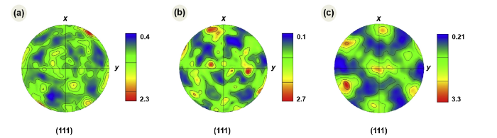 Fig. 5. Pole figures of as-deposited (a), HC (b) and HC + HR (c) samples.