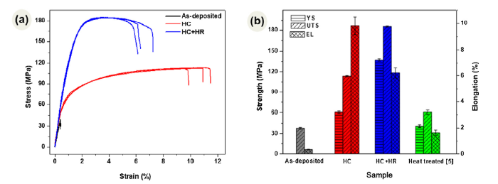 (4) Consequently, the strength (UTS) and elongation of the as-deposited sample was simultaneously improved from ~37 to 185 MPa and ~0.3% to 6.2%, respectively. In contrast to the isothermally heat treated sample, hybrid treatment resulted in about threefold higher strength and fourfold wider elongation.